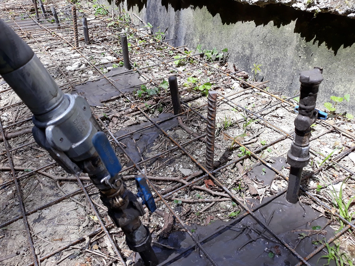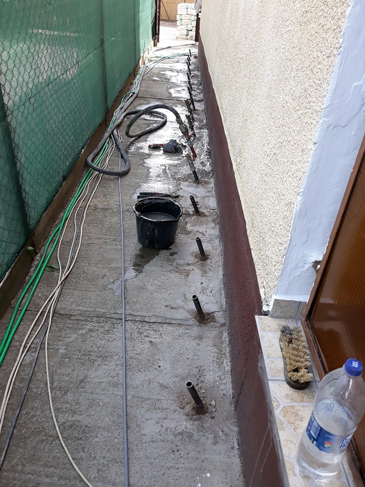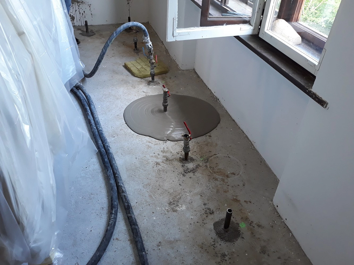 Bevezetjük az injektáló szondákat, majd azokon keresztül nagy nyomással bejuttatjuk a speciális kötőanyagot.